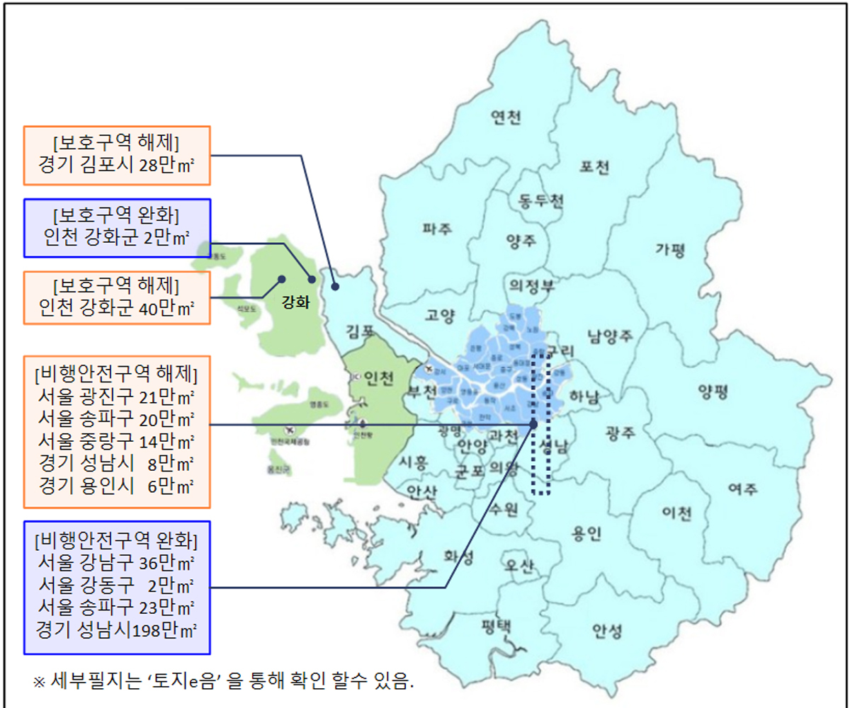 국방부는 제한보호구역이었던 김포시?강화군을 해제하고, 광화군 1곳을 통제보호구역에서 제한보호구역으로 완화한다고 29일 밝혔다. 비행안전구역이었던 서울 강남·강동·광진·송파·중랑구, 경기 성남·용인시도 해제 및 완화된다.