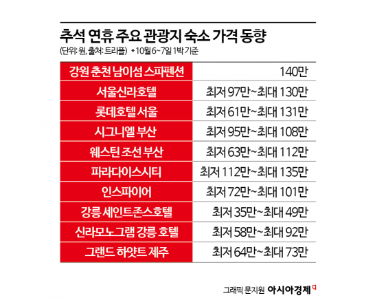 최장 열흘간 이어지는 추석 연휴를 맞아 주요 관광지의 숙소 가격이 천정부지로 치솟았다. 특급호텔은 물론 펜션에 이르기까지 1박당 100만원을 넘어선 곳을 어렵지 않게 찾아볼 수 있다. 긴 연휴를 활용해 국내 여행을 즐기려는 내국인과 단체 관광객에 대한 한시 무비자 입국이 허용된 중국인들이 국경절 연휴를 맞아 방한 수요가 몰린 영향이다. 이마저도 인지도가 있는 숙소의 경우 주요 객실 중에서도 가격대가 비싼 스위트룸이나 전망이 상대적으로 떨어지는 비인기 객실만 고를 수 있는 상황이다.