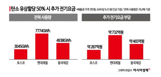 정부가 탄소배출권 유상할당 비중을 대폭 늘리기로 하면서 철강과 석유화학 등 에너지 다소비 업종이 전기요금으로 추가로 내야 할 금액이 7000억원 이상인 것으로 나타났다. 철강업계에서 한국전력공사(한전) 전기를 가장 많이 사다 쓰는 현대제철은 일년 영업이익의 절반을 전기료로 더 내야 하는 상황에 놓였다. 김성환 기후에너지환경부 장관은 "산업용 전기요금 인상을 최대한 억제하겠다"고 했지만, 업계에선 구조적으로 전기료 인상은 불가피하다는 볼멘소리가 나온다.