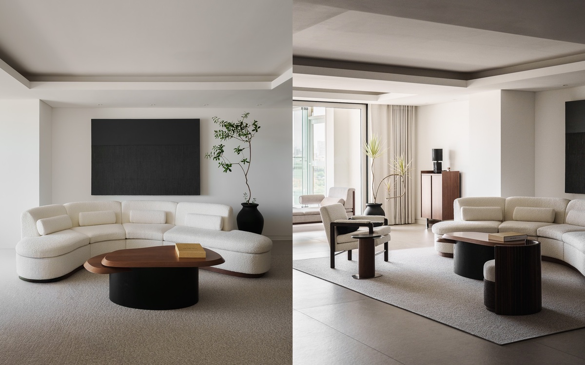 공개된 사진 속 신혼집은 탁 트인 한강뷰가 눈에 띄었다. 화이트 앤 월넛으로 모던하면서도 고전미를 강조한 인테리어로, 무몰딩 시공을 통해 깔끔한 선이 돋보였다. 또 비정형 모양의 부클레 소파와 월넛 테이블, 베이지색의 카펫, 먹물을 연상케 하는 검정 톤의 나이프화 그리고 대형 야자나무가 어우러져 현대 한옥의 분위기를 풍겼다.