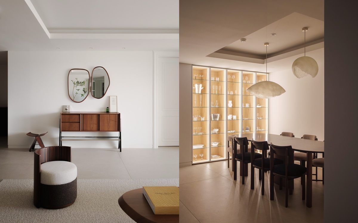 함께 공개된 다이닝 룸으로 보이는 공간은 간접등이 포함된 매립형 장식형 속 투명하거나 화이트 톤의 그릇을 배치해 포인트를 더했다. 또 월넛 톤의 타원형 식탁에 우드 앤 페브릭 의자를 레이어링해 거실과 통일감을 줘 연결했다. 한지처럼 보이는 특이한 조명 두 개를 높이차를 둬 동양미를 한층 높였다.