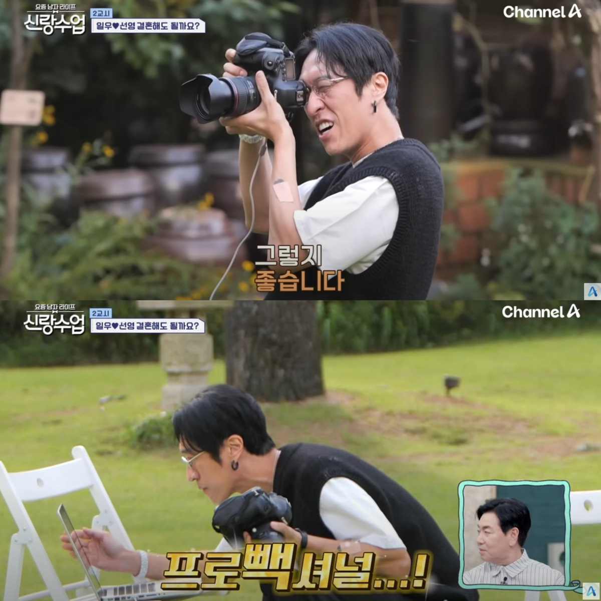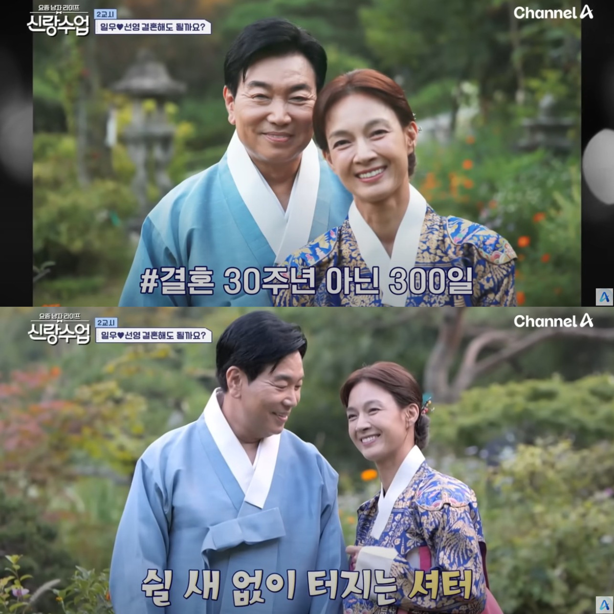 300일 기념사진 촬영에 나선 김일우와 박선영. 채널A 제공 김일우는 “벌써 선영을 만난 지 300일이 다가오더라. 기념사진을 찍으러 왔다”고 말했다. 두 사람은 흰 티에 청바지를 맞춰 입은 커플룩, 그리고 한복을 촬영 의상으로 착용하면서 다양한 콘셉트의 촬영을 소화해내 시청자들의 시선을 사로잡았다. 코요태 김종민은 촬영 보조로, 그리고 사진 촬영에 나선 사람은 다름 아닌 빽가였다. 김종민은 “최근에 야외 촬영을 해서 뭘 해야 하는지 안다”며 촬영 보조로서 의욕을 드러냈고, 빽가는 “잘 찍겠다”고 약속했다.