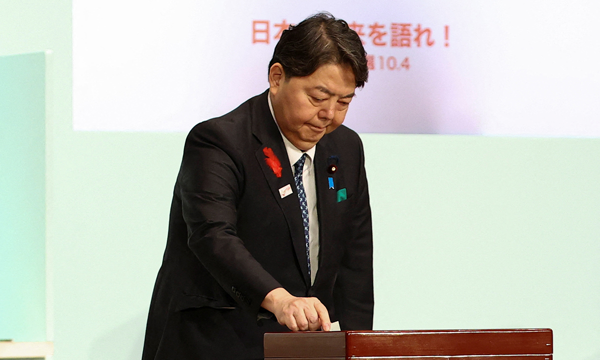 하야시 요시마사 관방장관. AFP연합뉴스 막판 거센 추격전을 펼치던 하야시 요시마사 관방장관은 국회의원 투표에서 72표를 얻어 2위에 올랐으나, 당원·당우표는 62표를 얻는 데 그쳤다. 합계 134표로 3위를 기록했다. 고바야시 다카유키 후보는 합계 59표, 모테기 도시미쓰 후보는 49표를 획득했다.