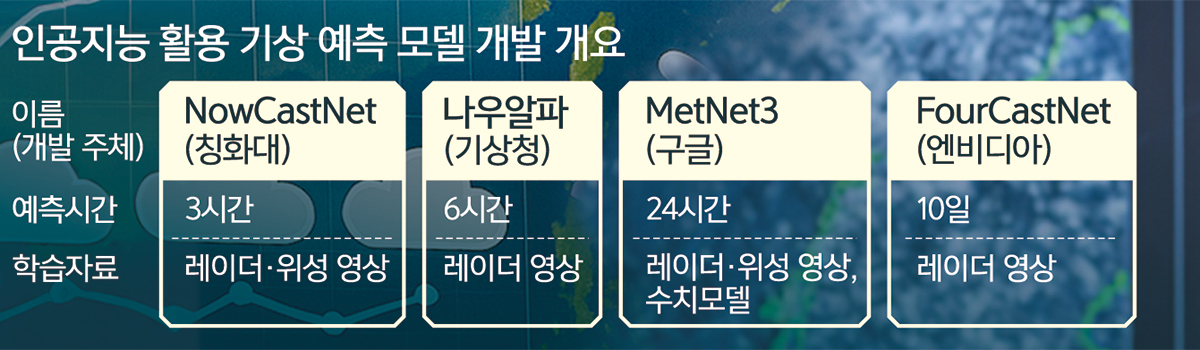 세계기상기구(WMO)와 기상청, 세계적 빅테크(거대기술기업)들의 고민은 이것이었다. 기후 위기 시대 ‘날씨’는 생활 양식에 큰 영향을 미치는 동시에 생명과 재산을 지키는 정보가 됐다. 짧은 시간 안에 좁은 지역에 쏟아지는 많은 비처럼 돌발적인 위험 기상의 출현으로 당장 몇 시간 뒤의 날씨를 예측하는 ‘초단기 예보’의 중요성도 커졌다. 기상 관측을 위한 세계 협력을 목표로 설립된 유엔의 기상학 전문 기구 WMO와 한국 기상청을 비롯한 세계 주요국 기상 기관들, 기술의 선두를 달리는 구글·엔비디아 등 빅테크들이 ‘AI 초단기 예측모델’을 개발하기 위해 뛰어든 배경이다.