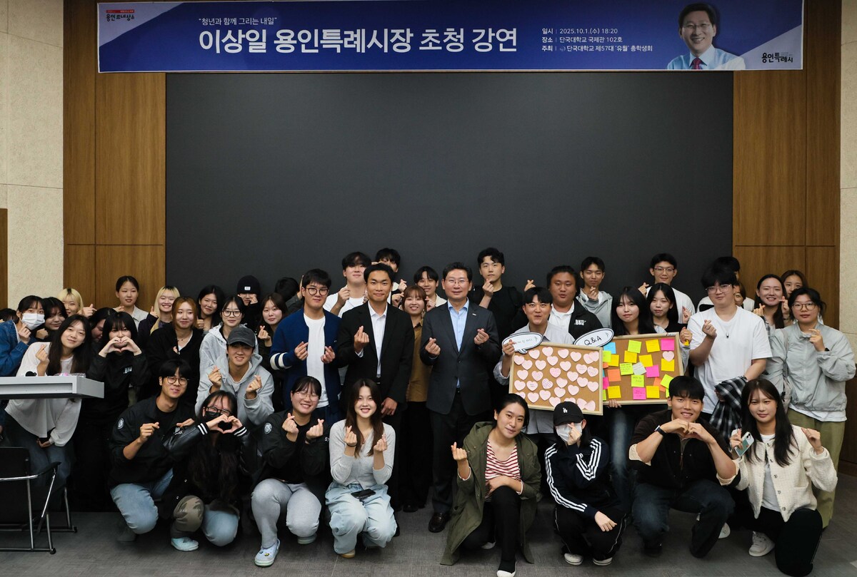 1일 단국대 국제관에서 이상일 시장과 학생들이 기념촬영을 하고 있다. 용인시 제공 앞서 이 시장은 이날 강연의 화두를 ‘청년과 함께 그리는 용인의 미래’로 잡았다. 국무조정실이 만 19~34세 청년을 대상으로 실시한 ‘2024년 청년 삶 실태조사’ 결과를 인용하며 △일자리 △인간관계 △소득·자산을 연계해 이야기를 풀어갔다.