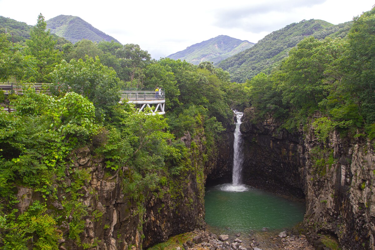 절벽 위에서 떨어지는 물줄기는 마치 자연이 연출한 거대한 극장 같다. 바위 아래 검푸른 소는 깊고 푸르다. 낙차 때 바람을 타고 공중에서 하얗게 흩어지는 물방울은 시원함을 풍긴다.