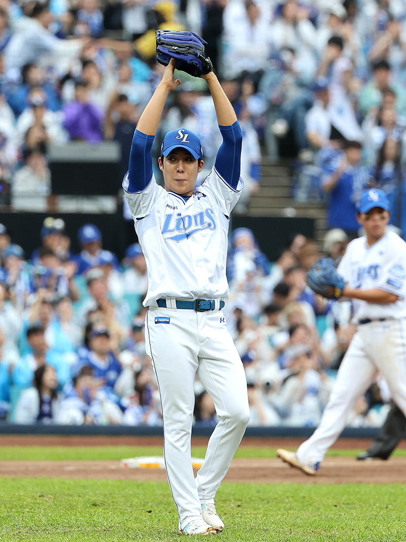 7일 대구 삼성라이온즈파크에서 열린 2025 KBO 포스트시즌 와일드카드 2차전 삼성 라이온즈와 NC 다이노스의 경기. 삼성 선발투수 원태인이 4회 초 NC 오영수의 높이 뜬 타구를 가리키고 있다. 연합뉴스 삼성은 7일 대구 삼성라이온즈파크에서 열린 WC 2차전에서 NC를 3-0으로 눌렀다. 이날 삼성은 1회말 연속 밀어내기 볼넷으로 2점을 얻은 뒤 선발 원태인이 106개의 공을 던지면서 6이닝 4피안타 2사사구 5탈삼진 무실점의 역투를 펼치며 승리에 이바지했다. 이로써 정규시즌 4위로 1승을 안고 WC를 치른 삼성은 5위 NC에 1차전(1-4)을 내줬지만, 2차전에서 승리하며 준PO에 진출했다. 지난해 삼성을 한국시리즈(KS) 무대에 올려놓은 박진만 감독은 올해 가을 무대 첫 관문을 통과했다. 반면 올해 처음 사령탑으로 부임해 정규시즌 막판 9연승 행진을 벌이며 포스트시즌행 막차를 타고 WC 1차전에서도 승리했던 이호준 NC 감독은 2차전 패배로 이번 가을 무대에서 퇴장했다. ‘푸른 피의 사나이’ 원태인의 투구가 가장 눈부셨다. KBO리그의 대표적인 ‘타자 친화 구장’인 대구 삼성라이온즈파크에서 올해에도 5승1패 평균자책점 3.03을 기록하며 강한 모습을 보였던 원태인의 강점은 WC 2차전에서도 변함없이 나타났다. 이날 던진 106개의 투구는 올해 원태인의 한 경기 최다 투구수였다.