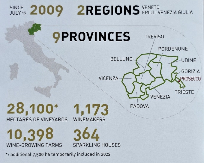 프로세코 생산현황(2022년 기준). 프로세코DOCg협회 카르티제 아래 등급은 프로세코 슈페리오레 리베(Superiore Rive)입니다. 아주 가파른 경사면 포도밭 43곳에 생산되는 와인들은 별개의 DOCG로 정해 관리합니다. 프로세코 DOCG 마을에서 만드는 와인은 착즙량이 100kg 당 70ℓ로 일반 프로세코 보다 양이 적습니다. 그만큼 품질이 좋은 포도즙만 사용합니다. 프로세코 DOC와 DOCG는 병목에 정부 인증 마크 라벨·인증 씰이 붙어있고 DOC는 푸른색, DOCG는 분홍색으로 구분합니다. 2022년 현재 프로세코 포도밭은 2만8100ha, 포도재배농가는 1만398개, 와이너리는 1173개, 2차발효와 보틀링까지 모두 커버하는 프로세코 하우스는 364개입니다. 2022년 기준 한행 생산량은 6억3800만병, 금액기준 33억5000만유로이며 생산량의 81%(5억1680만병·27억유로)를 수출합니다. 그만큼 프로세코가 전세계적으로 인기가 높다는 뜻으로 최대 수출국은 미국이며 영국, 독일, 프랑스 순으로 수출됩니다. 전체 수출 국가는 160개국이 넘습니다.
