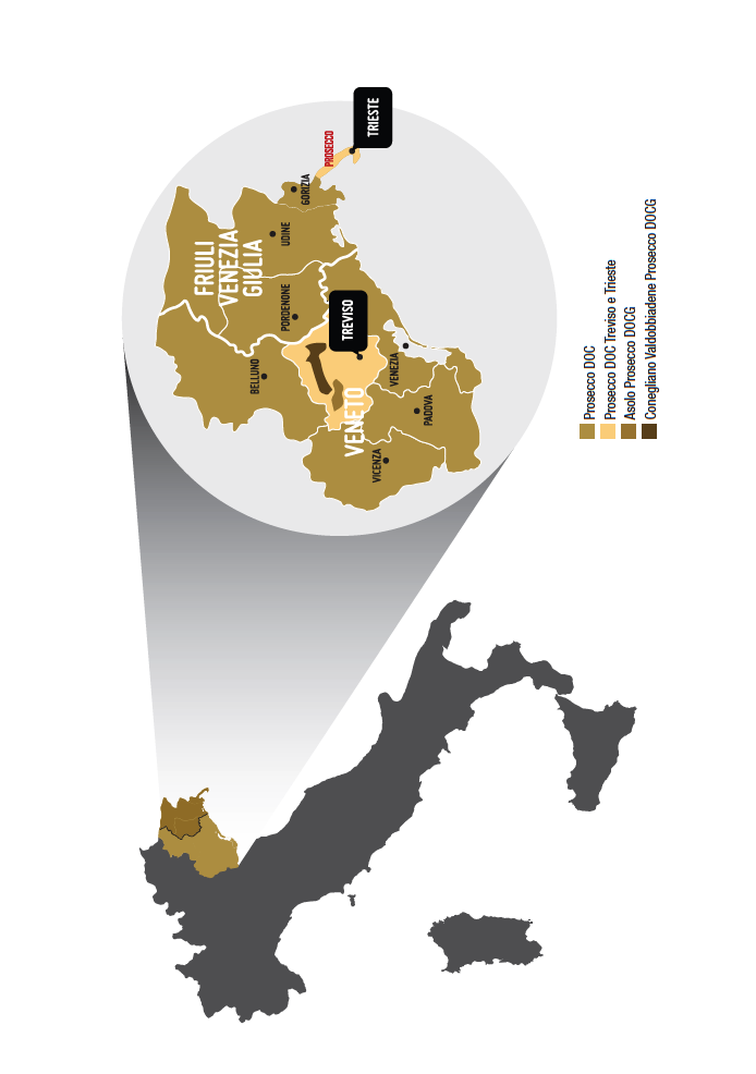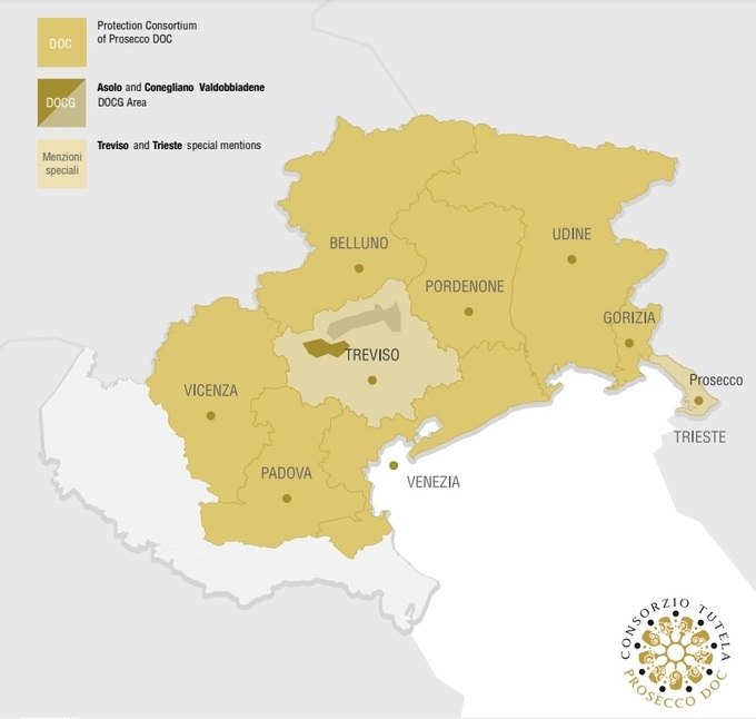 프로세코 생산지역. 프로세코DOC협회 ◆프로세코 생산지역 프로세코는 이탈리아 북동부의 돌로미티와 아드리아해 사이에 있는 베네토(Veneto)와 프리울리 베네치아 줄리아(Friuli Venezia Giulia) 9개 마을에서만 생산됩니다. 기후, 토양, 와인메이킹 전통이 어우러지면서 독특한 프로세코가 탄생했습니다. 프로세코 DOC(Denominazione di Origine Controllata·원산지통제명칭)가 적용되는 곳은 베네토 5개 마을(Treviso, Belluno, Padua, Venice, Vicenza), 프리울리 베네치아 줄리아 4개 마을(Trieste, Gorizia, Pordenone, Udine) 입니다. 프로세코 DOC에선 트레비소와 트리에스테가 가장 중요한 생산지로 프로세코의 역사와 함께 합니다. 수확·와인 제조·병입이 모두 트레비소와 트리에스테에서 이루어지는 경우 ‘Prosecco DOC Treviso’ ‘Prosecco DOC Trieste’라는 명칭을 병 레이블에 표기할 수 있습니다. 특히 트리에스테에는 ‘프로세코’라는 마을이 있습니다. 지금의 프로세코 명칭은 바로 이 마을에서 시작됐답니다.