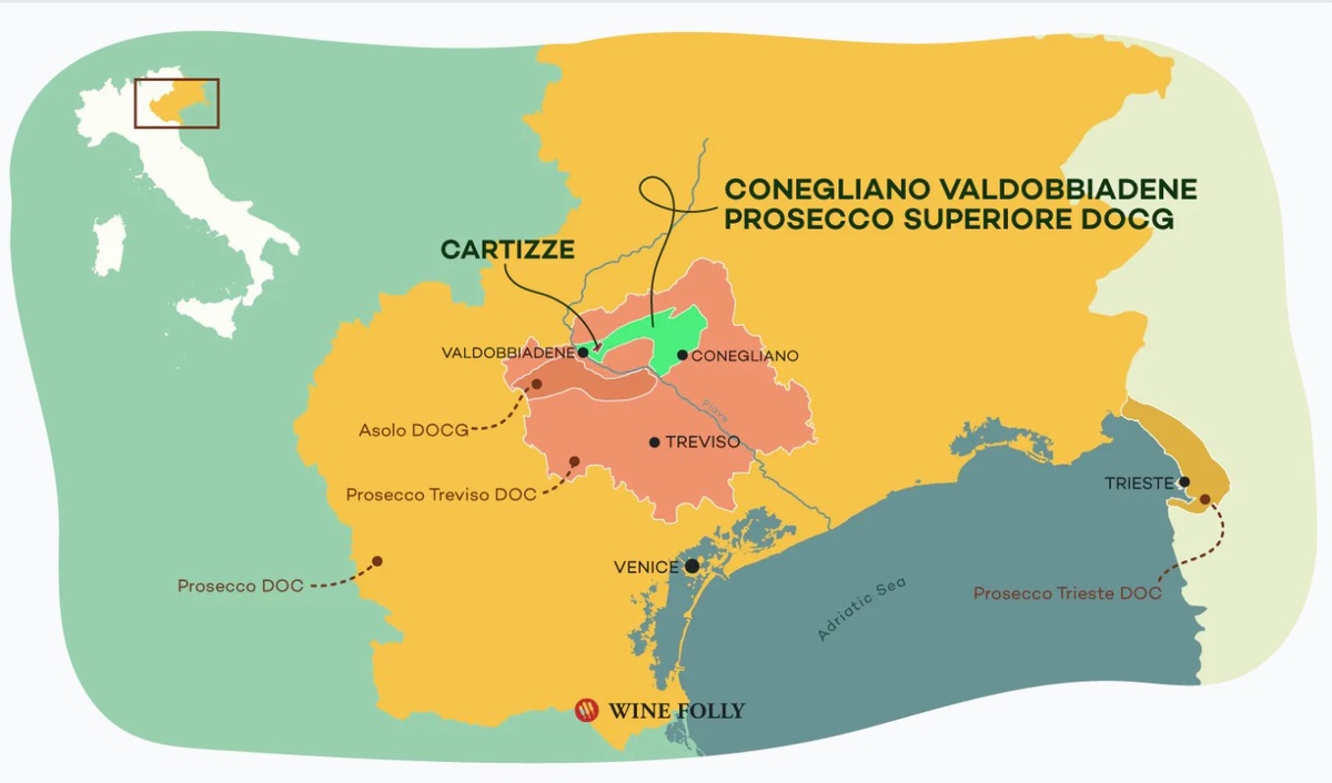 카르티쩨 위치. 와인폴리 ◆프로세코 ‘그랑크뤼 마을’ 카르티제 고급 프로세코가 생산되는 프로세코 DOCG(Denominazione di Origine Controllata e Garantita, 원산지통제·보증명칭)는 트레비소 중심에 있는 코넬리아노-발도비아데네(Conegliano-Valdobbiadene)와 아솔로(Asolo) 두 곳입니다. 차로 40분가량 떨어진 코넬리아노와 발도비아데네는 DOCG를 별도로 표기하기도 합니다. 발도비아데네에는 ‘그랑크뤼’로 부르는 최고의 포도밭이 있습니다. 바로 ‘카르티체(Cartizze)’로 병 레이블에 따로 표시합니다. 발도비아네데(Valdobbiadene) 마을 내 산토 스테파노(Santo Stefano)와 산 피에트로 디 바르보차(S. Pietro di Barbozza) 지구 사이 사이에 있는 카르티제 포도밭은 총 107ha이며 해를 잘 받는 남향 경사면에 조성돼 있습니다. 수백만년된 해양토로 조개류 화석이 섞인 쵸크(Chalk) 토양 입니다. 쵸크 토양은 상파뉴 그랑크뤼 마을이 몰려있는 샤르도네 생산지 꼬뜨 데 블랑(Cote des Blancs)과 같은 토양으로 일반 라임스톤 토양보다 산도가 훨씬 더 생기발랄하고 높으며 풍부한 미네랄을 지닌 포도가 생산됩니다. 수확시기도 다른 곳보다 2주 정도 늦으며 아주 풍성하면서도 일관성 있는 구조감이 특징인 프로세코가 만들어 집니다.