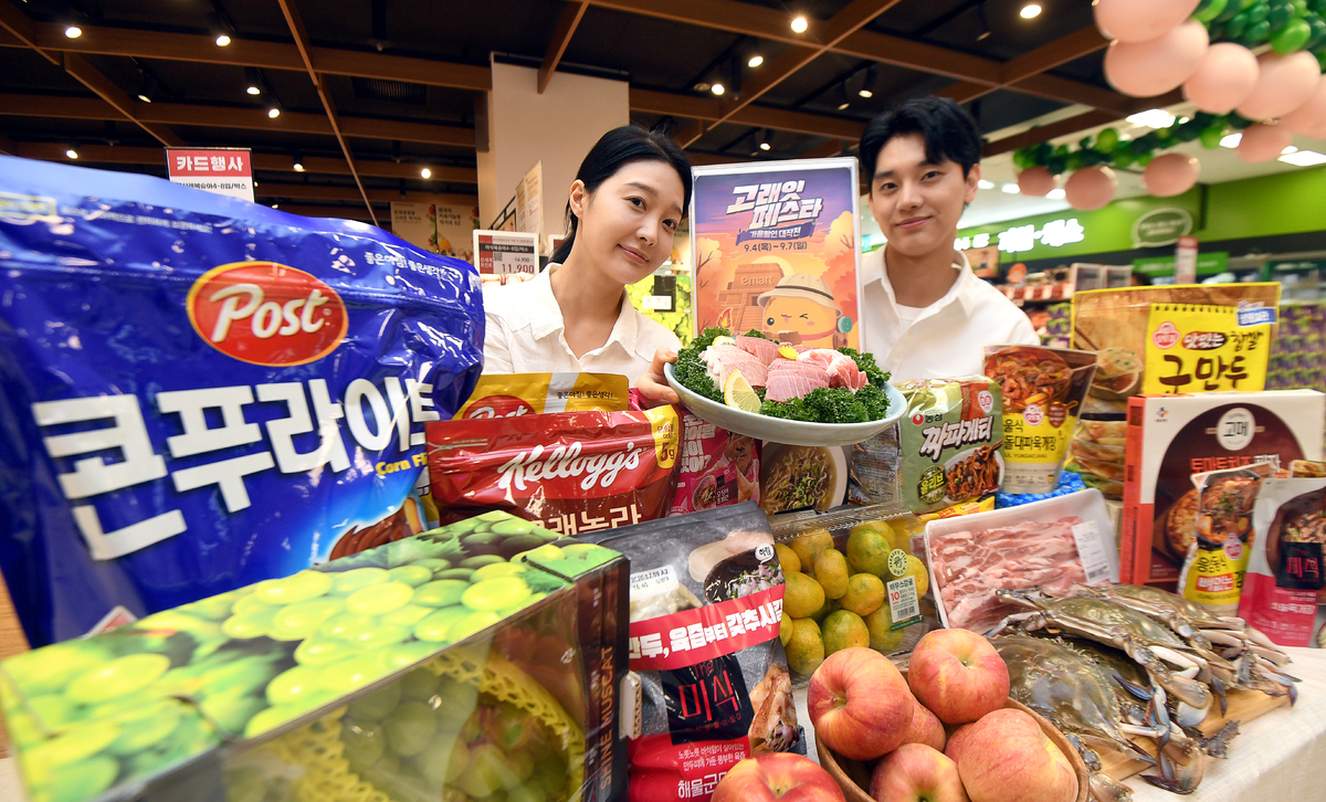 2일 오전 서울 용산구 이마트 용산점에서 모델들이 고래잇 페스타 제품을 소개하고 있다. 김경호 기자 ‘가을 햇꽃게(100g·국내산)’는 4일과 5일 양 일간 신세계 포인트 적립 시 60% 할인한 788원에 판매해, 10년 전 보다 저렴한 가격에 또 한번 맛볼 수 있는 기회를 마련했다. 같은 기간 ‘햇사과(3입~8입)’는 8900원에, ‘알찬란 30구(대란)’는 행사카드 결제 시 2000원 할인한 5980원에 판매한다.