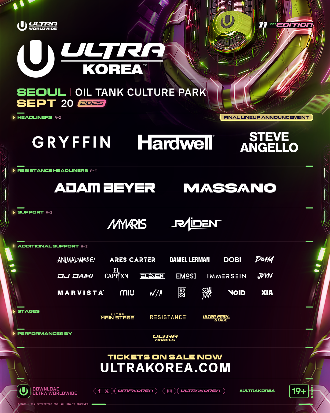 또한 올해 울트라 코리아는 총 세 개의 스테이지로 운영된다. 글로벌 아티스트들의 압도적인 무대를 선보일 메인 스테이지(Main Stage), 울트라가 자랑하는 언더그라운드 하우스·테크노 사운드의 중심인 레지스탕스(RESISTANCE) 스테이지, 그리고 지역 아티스트들에게 기회를 제공하는 울트라 파크(ULTRA Park) 스테이지다.