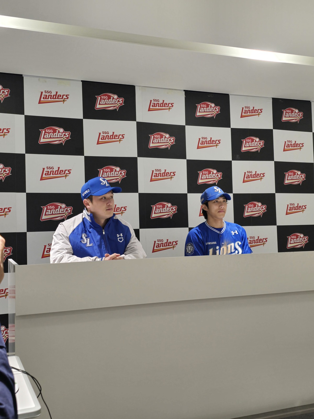 지난 9일 인천 미추홀구 SSG랜더스필드에서 열린 2025 KBO 포스트시즌 준플레이오프 1차전 삼성 라이온즈와 SSG 랜더스의 경기, 이날 선발투수 최원태가 SSG에 5-2 승리를 거두며 포스트시즌 첫 승리를 기록한 뒤 기뻐하고 있다. 뉴시스 이날 경기에서 결승포가 된 선두타자 홈런 포함 3타수 1안타 1홈런 1타점 1득점 1볼넷 1사구를 기록한 이재현은 6이닝 8탈삼진 무실점 호투로 생애 첫 포스트시즌 승리투수가 된 최원태와 함께 수훈선수로 인터뷰실에 들어섰다. 이재현은 “오늘 경기에 들어가기 전에 보니 상대 투수가 치기 쉽지 않은 구위를 갖고 있다고 생각했다. 그래서 가장 확률이 높은 직구에 포커스를 맞춰 승부했던 것 같다”라고 선두타자 초구 홈런의 장면을 돌아봤다. 이어 포스트시즌 선두타자 초구 홈런이 역대 최초라고 귀띔해주자 이재현은 “오늘 경기의 선취점이 난 것이 중요하지, 그런 기록 자체는 크게 의미가 있는 것 같지는 않다”고 담담한 모습을 보였다.