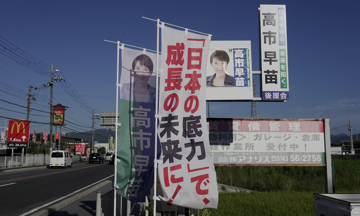 일본 집권 자민당 총재로 선출된 다카이치 사나에의 지방 의원사무실 앞에 캠페인 깃발과 포스터가 붙여져 있다. 로이터연합뉴스 ③ 정권교체는 어렵나 일각에서는 정권교체 가능성을 제기하기도 한다. 입헌민주당은 야권 총리 후보를 국민민주당 다마키 유이치로 대표로 단일화하자고 이미 제안한 터다.