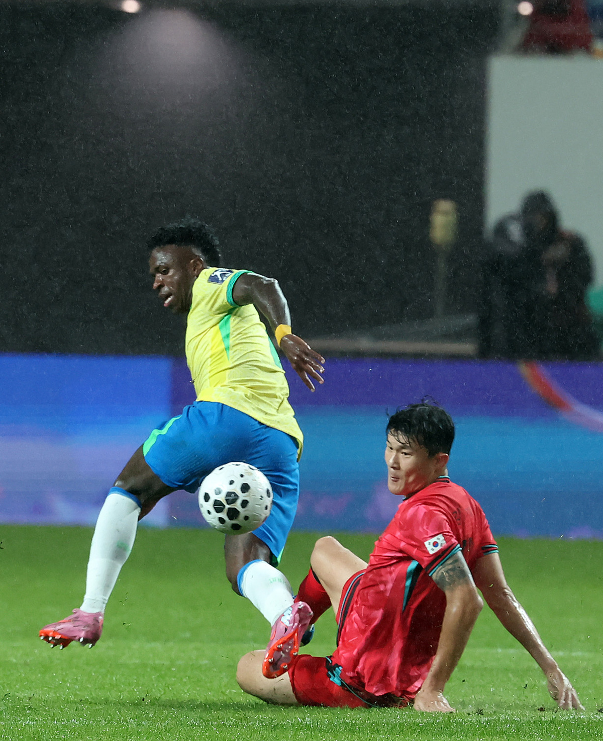10일 서울월드컵경기장에서 열린 하나은행 초청 축구국가대표팀 친선경기 대한민국과 브라질의 경기, 전반전 대한민국 김민재가 브라질 비니시우스의 돌파를 태클로 막아서고 있다. 뉴스1