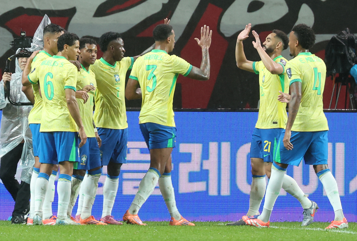 10일 서울 마포구 서울월드컵경기장에서 열린 한국과 브라질 축구 대표팀의 친선경기. 브라질 호드리구가 골을 넣은 뒤 동료들의 격려를 받고 있다. 연합뉴스