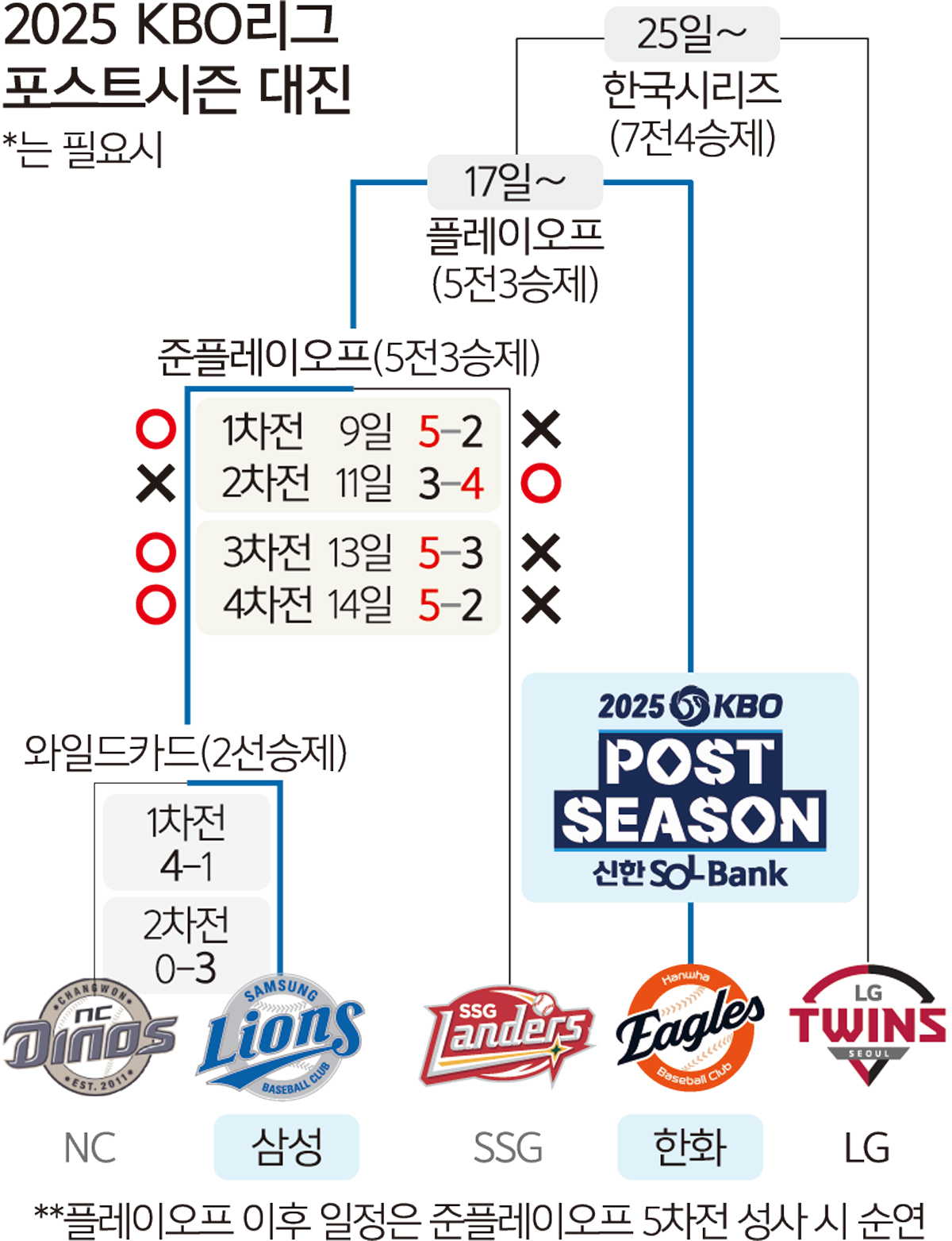 시리즈 전적 2승1패로 앞서고 있던 삼성이 이날 8회 터진 4번 타자 르윈 디아즈의 결승 투런포를 앞세워 SSG에 5-2로 승리했다. 이로써 정규시즌 4위 삼성은 시리즈 전적 3승1패로 3위 SSG에 하위 팀이 상위 팀을 꺾고 다음 시리즈에 진출하는 ‘업셋 승리’를 거두면서 정규시즌 2위 한화가 기다리고 있는 플레이오프(PO·5전3승제)에 올랐다. 삼성과 한화의 PO 1차전은 17일 대전 한화생명이글스파크에서 열린다. 삼성과 한화가 가을 무대에서 맞붙는 건, 2007년 준PO 이후 18년 만이다.