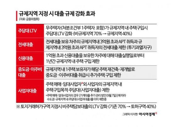 전세대출 보유자가 투기 및 투기과열 지역 내 3억원 초과 아파트 취득 시 전세대출은 회수되며 1억원 초과 신용대출 보유 차주는 대출 실행일로부터 1년간 규제지역 내 주택 구입이 제한된다. 규제지역 내 1주택 보유자가 해당 주택의 재건축·재개발에 따른 중도금·이주비 대출을 받을 경우 추가 주택구입이 제한되며 규제지역 주택 구매를 위한 사업자 대출 역시 제한된다. 또한 토지거래허가구역 신규 지정에 따라 상가·오피스텔 등 비주택담보대출의 LTV도 기존 70%에서 40%로 낮아진다.