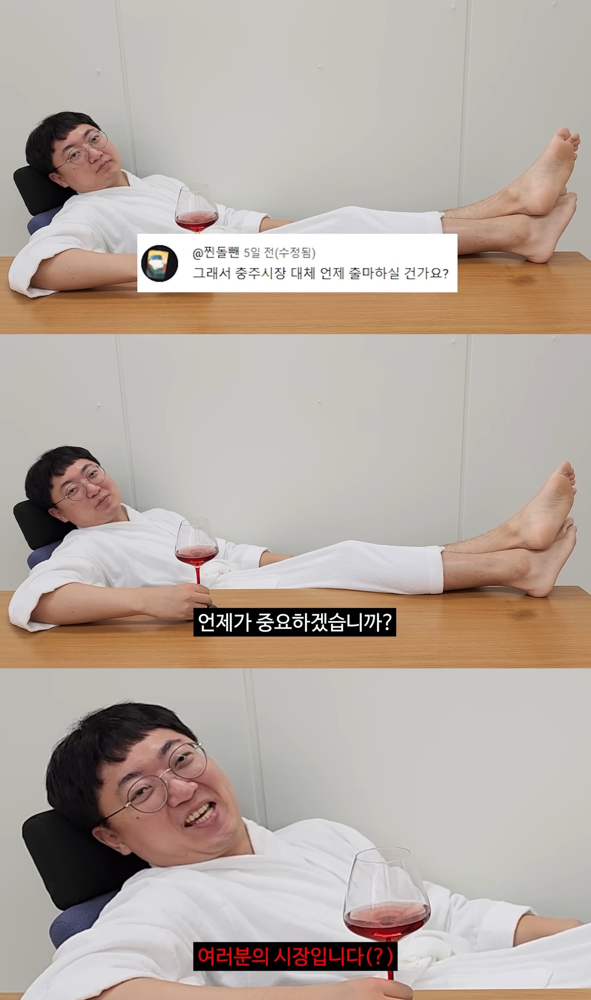 지자체 유튜브 최초 구독자 90만 돌파라는 대기록답게 충주맨은 한층 더 거만(?)해진 차림으로 등장해 네티즌들에게 웃음을 안겼다. 영상 속 충주맨은 목욕 가운 차림으로 와인잔을 들고 의자에 반쯤 누운 채로 소감 발표를 시작했다.