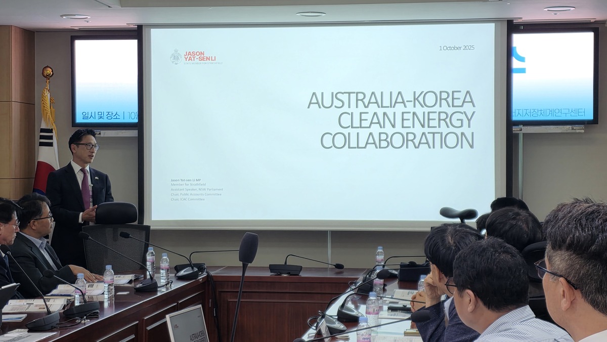 제이슨 얏센 리 의원이 호주 정부의 탄소배출 제로(Net-Zero Manufacturing) 프로젝트와 한-호주 기술 협력 전략에 대해 주제 발표하고 있다. 전남대 에너지저장체계연구센터 제공 이후 김한성 연세대 교수 사회로 진행된 패널 토론에서는 서울대, 연세대, 전남대, 한국생산기술연구원, 한국기계연구원, 한국전력공사, 전남도 관계자들이 참석해 신재생에너지 출력 불안정 해소를 위한 차세대 에너지 저장 기술, 양국 공동 실증 및 국제 표준화, 수소·ESS 산업 생태계 조성 등 실질적 협력 방안을 논의했다. 정호영 전남대 교수(에너지저장체계연구센터장)는 “이번 포럼은 한국과 호주가 각자의 강점을 살려 차세대 에너지 디바이스 공동연구와 상용화를 가속화하는 중요한 발판”이라며 “실증 협력을 통해 양국의 기술 경쟁력과 시장 진출을 동시에 강화하겠다”고 밝혔다.