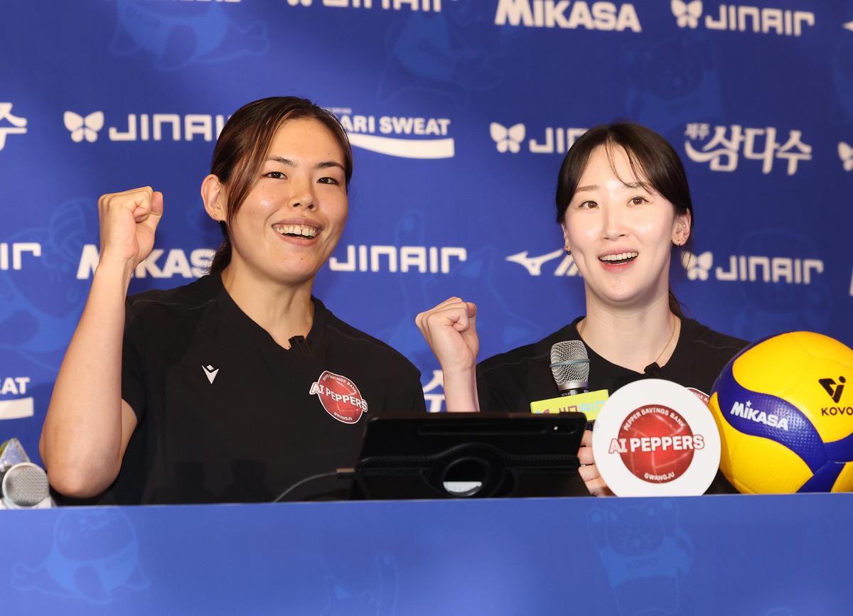 16일 서울 호텔리베라 청담에서 열린 '진에어 2025~2026 V-리그 여자부 미디어데이'에서 페퍼저축은행 고예림과 시마무라 하루요가 구호를 외치고 있다. 연합뉴스 본 기자가 ‘유튜브 쇼츠를 보다보면 미녀 배구선수 랭킹 이런 컨텐츠를 자주 보게 된다. 예림 선수도 본 적 있냐’고 묻자 고예림은 “그쵸. 뜨는 데 어떡해요. 저도 본 적 있죠”라고 답했다. 그런 컨텐츠에서 주로 예림 선수는 랭킹이 높아서 이름이 뒤에 나오는데 그럴 때 기분좋냐고 묻자 고예림은 웃으며 “아무래도 좋죠”라며 웃었다. 오랜 기간 미녀 배구선수의 아이콘격이었던 고예림. 그녀에게 이 타이틀을 위협하는 후배가 있냐고 묻자 “진짜 장난이 아니라 우리 여자배구 선수들 다 예쁜 것 같아요. 제 순위는 비밀로 할게요”라고 답했다. ‘여전히 1등이라고 생각하니까 비밀인 것 아니냐. 1등이 아니라면 한 명만 이름을 알려달라’고 되묻자 “한명만 대면 후배들 삐져서 안돼요”라고 화답했다.