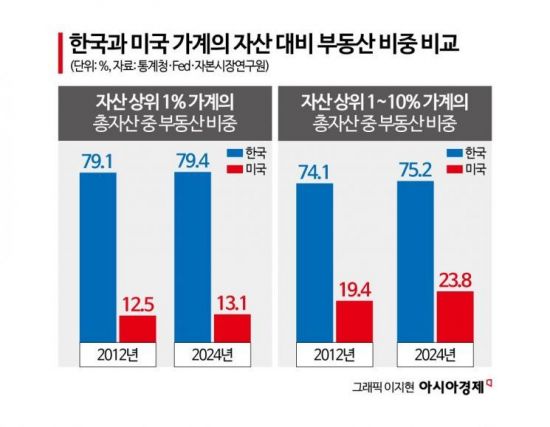 17일 자본시장연구원과 통계청 등에 따르면 지난해 기준 우리나라 순자산 상위 1% 가계의 총자산에서 부동산 자산이 차지하는 비중은 79.4%에 달했다. 2020년 77.3%에서 꾸준히 올라 역대 최고치를 경신한 것으로 조사됐다. 순자산 1~10% 구간에서도 자산에서 부동산이 차지하는 비중이 75.2%에 달했고 상위 10~50% 구간에서는 70.9%였다. 국내 가계의 상당수가 자산의 70% 이상을 주택으로 보유하고 있다는 해석이 가능하다.