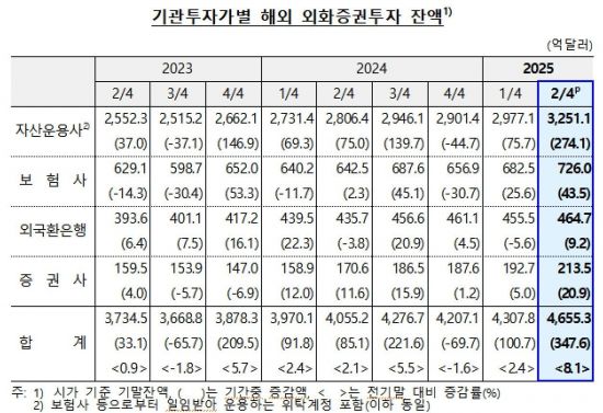 기관투자가별로 보면 자산운용사의 투자 잔액이 3251억1000만달러로 1분기 대비 274억1000만달러 증가했다. 보험사도 726억달러로 43억5000만달러 늘었다. 증권사(213억5000만달러) 역시 20억9000만달러 증가했고, 외국환은행(464억7000만달러)도 9억2000만달러 늘어 모두 투자 잔액이 증가했다.