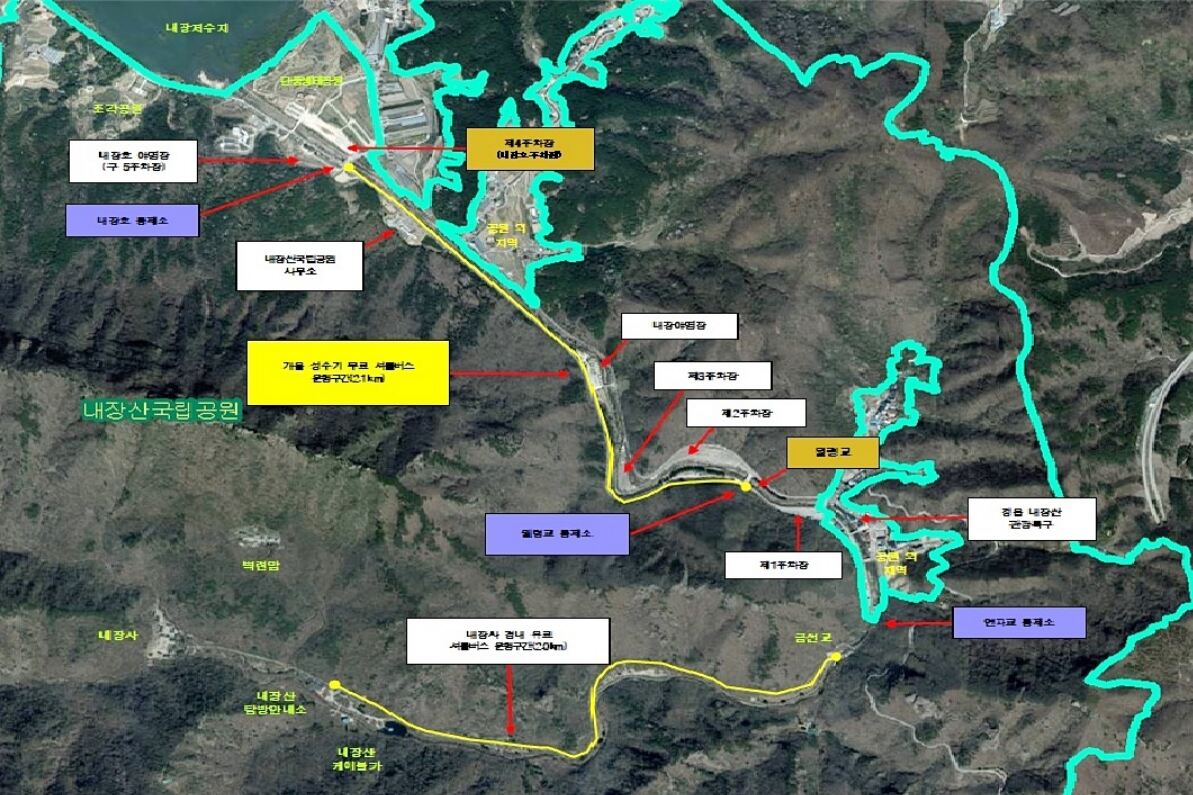 국립공원공단 내장산국립공원사무소가 가을 단풍철 탐방 편의를 위해 마련한 셔틀버스 운행 노선도. 내장산국립공원사무소 관계자는 “단풍 절정기에 방문 차량이 몰릴 경우 극심한 정체가 예상되는 만큼 탐방객들이 대중교통과 무료 셔틀버스를 적극 이용해 줄 것”을 당부했다.