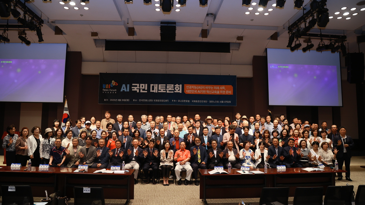 지난 26일 서울 프레스센터에서 열린 ‘AI 대전환 시대, 교육의 미래를 묻다’라는 주제로 열린 정책 토론회 참석자들이 기념 촬영을 하고 있다. 유니오픈포럼 제공 패널로는 김용호 서울시 의원은 지방정부의 교육 정책과 예산 집행의 현실을 짚으며, 공공의 역할과 책임을 강조했다. 박은희 전국학부모단체연합 대표는 학부모의 입장에서 디지털 교육의 장단점을 분석하고, 학생 중심의 교육환경 조성 필요성을 제언했다. 이원근 한국열린사이버대 AI융합학과 객원교수(전 국회입법조사처 조사관)는 AI 융합 교육의 법적·제도적 기반 마련의 필요성을 강조하며, 입법적 관점에서의 정책 제안을 제시했다. 위계점 박사(한성대 행정대학원 특임교수)는 교육 정책의 실행력과 거버넌스 문제를 행정학적 관점에서 진단했다. 주최 측은 “이번 토론회는 AI교육의 갈 바를 논의하는 의미있는 첫 출발이라면서, 향후 더 다양한 의견을 수렴하여 최선의 방안과 실천 전략을 도출할 수 있기를 바란다”고 밝혔다.