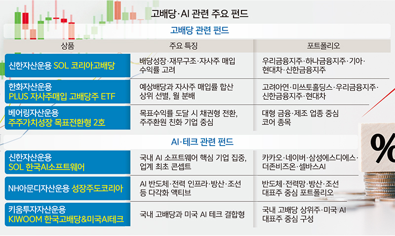 정부의 증시 부양 기조와 주주환원 강화 흐름에 힘입어 고배당 펀드 상품이 각광을 받고 있다. 산업 전반에 확산하는 인공지능(AI) 수요에 맞춰 반도체와 소프트웨어, 전력 인프라 같은 성장 분야를 묶은 상품 출시도 잇따르고 있다. 새정부 정책을 반영한 고배당과 테크주를 한데 묶은 펀드도 소비자의 호응을 이끌어내고 있다. ◆고배당·자사주 매입 기업에 집중투자
