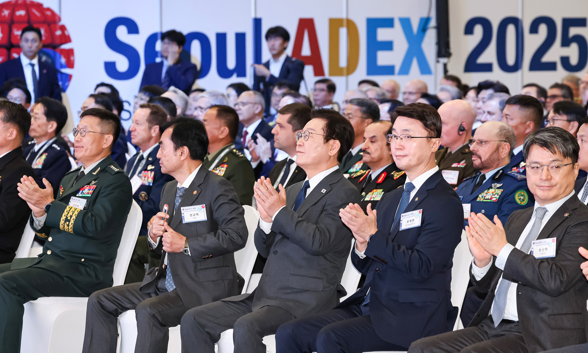 李 “국방 기술 주권 확보” 이재명 대통령이 20일 경기 고양 킨텍스에서 열린 서울 국제 항공우주 및 방위산업 전시회(ADEX·아덱스) 2025 개막식에 참석해 박수를 치고 있다. 이 대통령은 이날 축사에서 “과감한 투자와 지원으로 대한민국을 글로벌 4대 방위산업, 항공우주 강국으로 도약시키겠다”고 밝혔다. 대통령실사진기자단 한화에어로스페이스, 한화시스템, 한화오션 등 한화 방산 3사는 ‘AI 디펜스 포 투모로우’(AI Defense for Tomorrow)를 주제로 역대 최대규모인 1960㎡ 통합관을 운영한다. 차세대 수출전략 상품인 배회형 정밀유도무기(L-PGW)를 처음 선보이며 K-9 자주포가 세계 최초의 유·무인 복합 자주포인 K-9A3로 발전해 나갈 로드맵, 차세대 전략 수상함, 4차 발사를 앞둔 누리호를 비롯해 초고해상도(UHR) 합성개구레이더(SAR) 위성 등을 소개한다 현대로템은 유·무인 복합전투체계(MUM-T)를 시연해 육상 전투 플랫폼의 AI화를 강조한다. K-2 전차와 다목적 무인차량 HR-셰르파가 연동 운용되는 시연을 진행하며, AI 기반 자율주행·원격통제 기술을 공개한다. LIG넥스원은 국산 KF-21 전투기에 탑재될 항공무장체계 등을 공개한다.