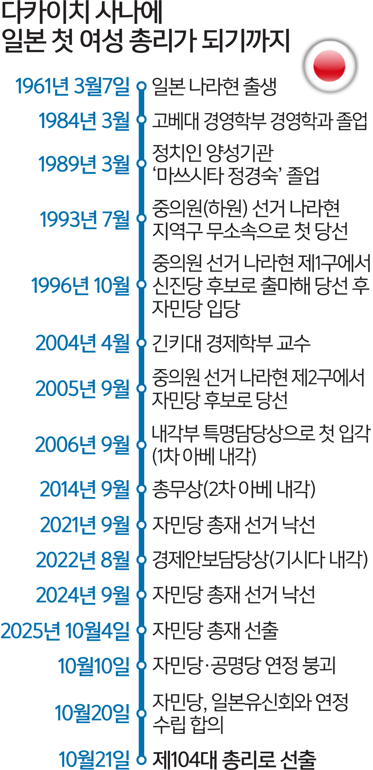 ‘여자 아베’라고 불릴 정도로 강경 우파 성향인 다카이치 사나에 자민당 총재가 우파 정당 일본유신회와 손을 잡고 21일 일본의 새 총리로 선출됨에 따라 일본 정권의 보수색이 짙어질 것으로 전망된다. 다카이치 총리는 시마네현이 독도 영유권을 주장하며 만든 ‘다케시마(독도의 일본식 표현)의 날’에 정부 참석자의 급을 높여야 한다고 주장한 바도 있어 최근 3년여간 훈풍이 불고 있는 한·일관계가 과거사 문제로 다시 악화할 수 있다는 우려가 나온다.