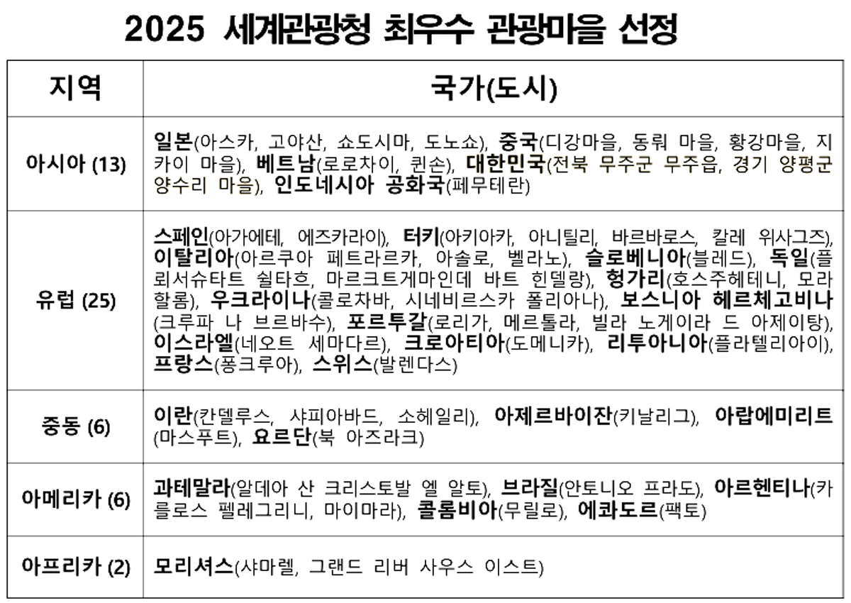 전북 무주군 무주읍이 경기 양평군 양수리 마을과 함께 세계관광청(UN Tourism) 이 주관한 ‘2025년 세계 최우수 관광마을(Best Tourism Villages)’ 에 선정됐다. 세계 최우수 관광마을은 각국의 농어촌 지역을 대상으로 문화 및 자연 자원, 경제·사회·환경적 지속 가능성, 관광 개발과 가치 통합 등 10개 항목을 종합 평가해 결정됐다. 시상식은 지난 17일 중국 저장성 후저우시 안지현 국제컨벤션센터에서 열렸다.