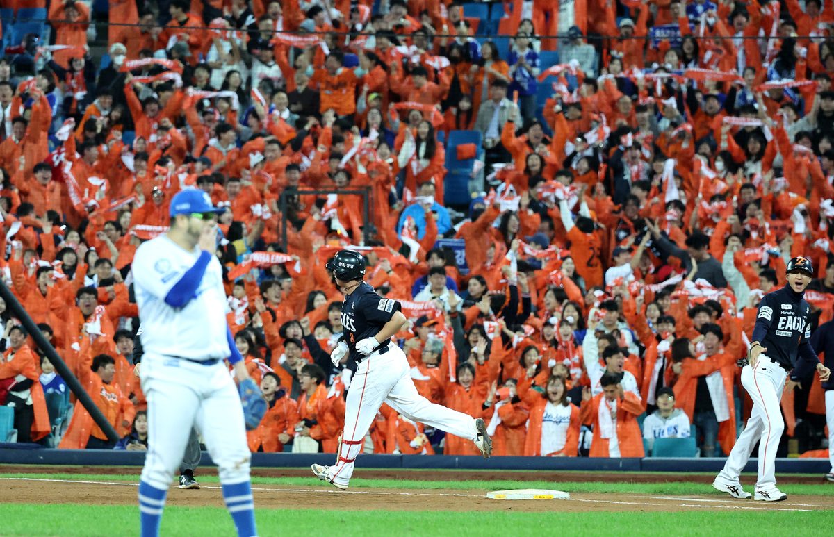 21일 대구 삼성라이온즈파크에서 열린 프로야구 2025 신한 SOL뱅크 KBO 플레이오프 3차전 삼성 라이온즈와 한화 이글스의 경기, 5회초 2사 3루 상황 한화 노시환이 역전 2점 홈런을 때린 뒤 홈을 밟으며 기뻐하고 있다. 뉴스1