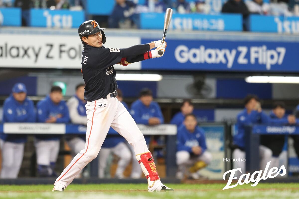 우선 타격감이 뜨겁다 못해 타오를 정도다. 플레이오프 3경기 타율은 무려 0.583(12타수 7안타). 시리즈 향방을 가를 중요한 일전으로 평가받은 3차전에서도 한화의 선취점을 책임진건 하주석의 우익수 방면 적시 2루타였다. PO 2,3차전에서 모두 4타수 3안타를 때려낸 하주석의 존재감은 반짝반짝 빛나고 있다. 22일 대구 삼성라이온즈파크에서 열린 2025 KBO 포스트시즌 플레이오프 4차전을 앞두고 취재진을 만난 김경문 감독도 하주석을 향해 흐뭇한 마음을 숨기지 않았다. 그는 “하주석이 기대 이상으로 잘 해주고 있다. 끝까지 잘 해주길 바란다”고 말했다.