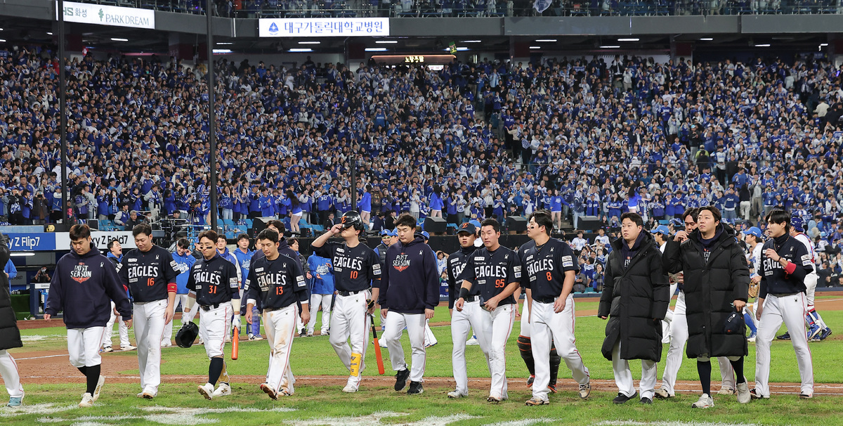 한화 이글스와 삼성 라이온즈의 경기에서 4-7로 패배한 한화 선수들이 아쉬워하고 있다. 뉴스1 투수를 바꾸지 말아야 할 땐 바꾸고, 바꿔야 할 때는 바꾸지 않았던 한화 벤치와 달리 1승2패로 벼랑 끝에 몰린 삼성 벤치는 기민하게 움직였다. 원태인이 5이닝 4실점으로 물러난 이후 5차전 선발 예정이었던 외국인 투수 가라비토를 6회부터 올려 7회까지 2이닝을 삭제했고, 이호성과 마무리 김재윤을 올려 경기를 매조지했다. 4차전 데일리 최우수선수(MVP)는 당연히 4타수 3안타(2홈런) 6타점의 김영웅 차지였다. 경기 뒤 승장인 삼성의 박진만 감독은 “김영웅 선수가 쓰러져가는 우리 팀을 일으켜세웠다. 오늘 같은 짜릿함은 지도자하면서 처음 느껴본 것 같다. 기술적으로도, 멘탈적으로도 김영웅은 최고의 선수다”라고 극찬했다.