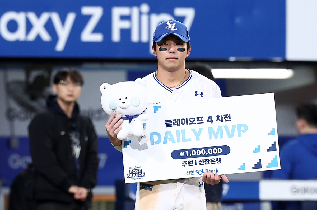 삼성 김영웅이 데일리MVP에 선정된 후 기념촬영을 하고 있다. 뉴스1 이미 폰세를 쓸 타이밍을 놓친 한화는 6회 김서현을 구원 등판한 한승혁을 7회에도 올렸다. 그러나 한승혁은 구자욱과 디아즈를 몸에 맞는 공과 볼넷으로 내보내며 위기에 몰렸다. 김영웅 앞에 또 한 번 주자 2명의 밥상이 차려진 것. 투수를 바꿔야할 타이밍이었지만, 한화 벤치는 그대로 한승혁을 밀어붙였고, 돌아온 결과는 또 하나의 쓰리런 홈런이라는 ‘철퇴’였다. 한승혁의 시속 145㎞짜리 포심 패스트볼이 밋밋하게 밀려들어온 것을 절정의 타격감을 자랑하는 김영웅이 놓칠리 없었다. 김영웅이 퍼올린 타구는 아름다운 호를 그리며 달구벌 하늘로 날아가 우측담장을 훌쩍 넘겼다. 삼성의 7-4 역전. 이 한 방으로 이날 승부는 끝났다.