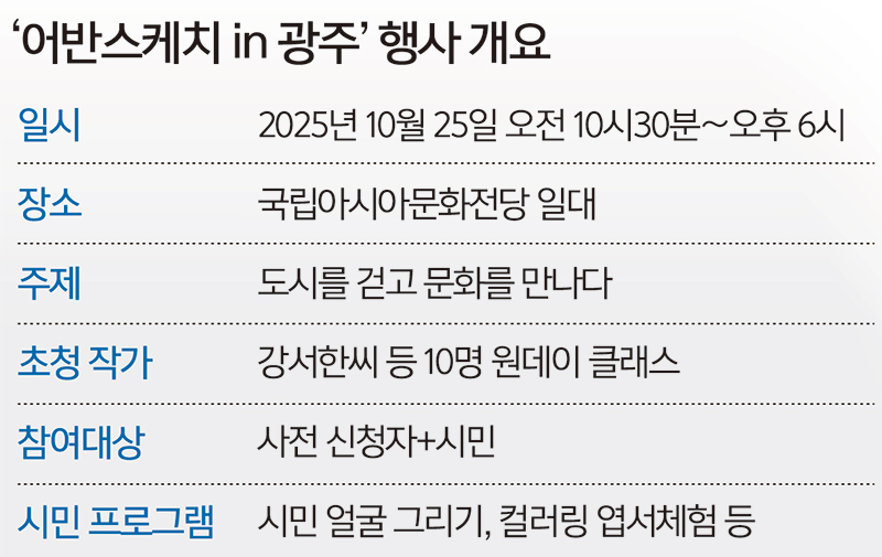 ‘광주 도심의 문화자산과 풍경을 스케치로’. 전국 어반스케쳐스(Urban Sketchers·특정 도시, 마을 현장에서 스케치를 담는 사람들)의 축제인 ‘2025 어반스케치 in(인) 광주’가 25일 광주 동구 국립아시아문화전당 일대에서 열린다.