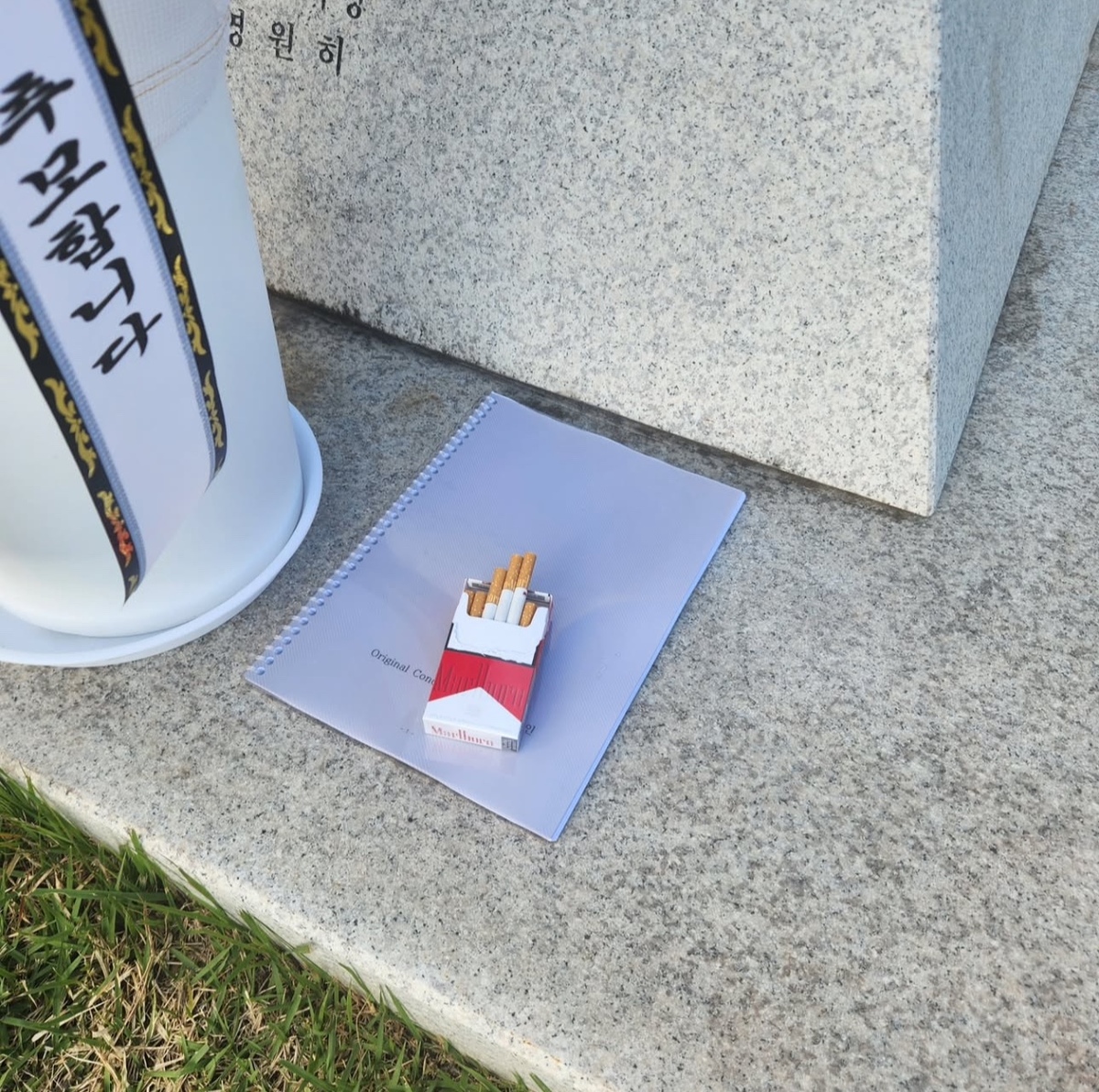 사진에는 고인의 묘소와 여러 추모 화환, 그리고 홍경민이 직접 올려놓은 책자와 편지가 있었다.