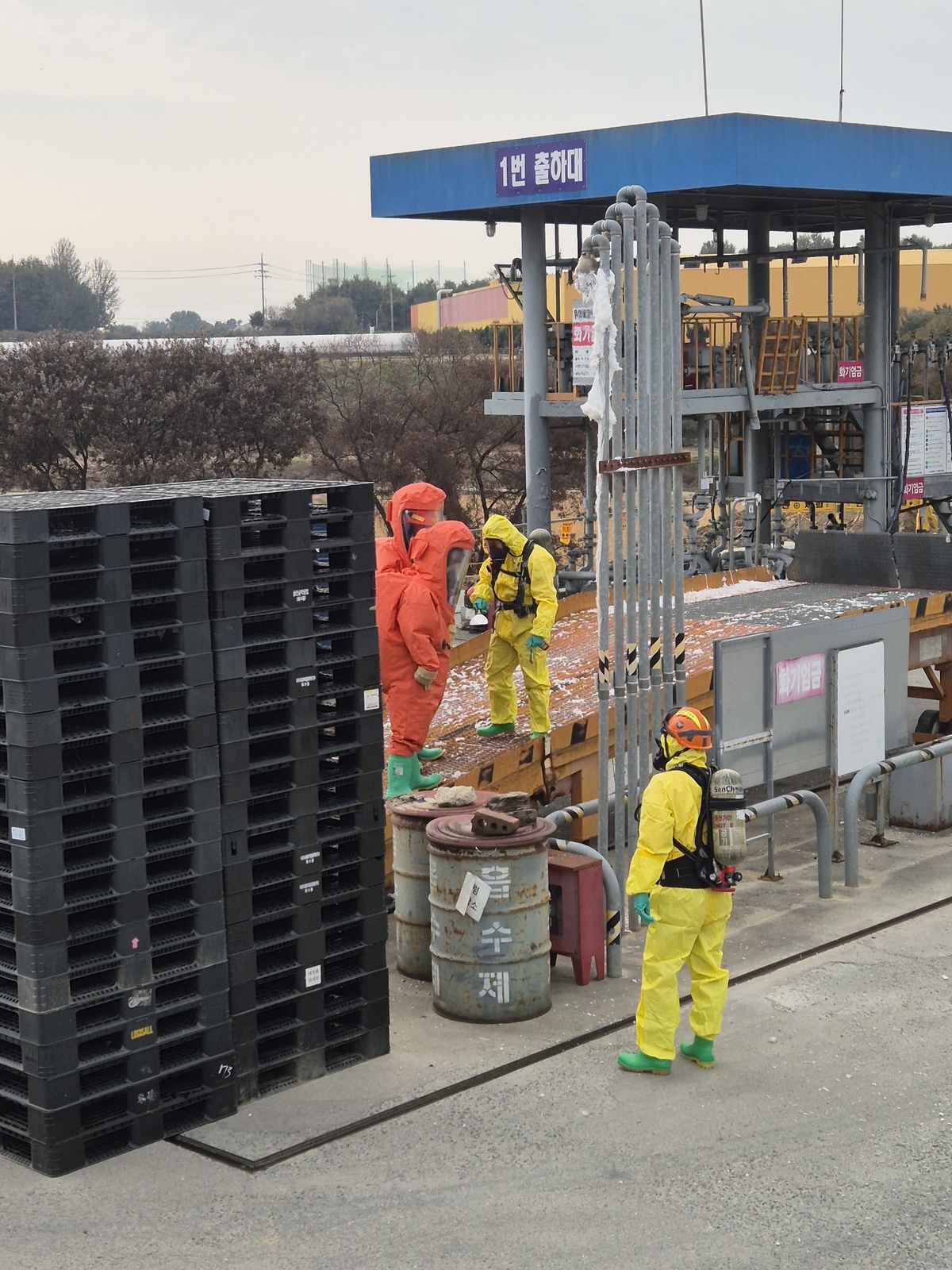 26일 음성소방서에 따르면 이날 오전 9시56분쯤 충북 음성군 대소면의 한 석유 판매업체 지하 탱크에서 비닐아세테이트모노머(VAM) 400ℓ가 흘러나왔다. “화학물질 냄새가 심하다”는 신고를 접수받고 현장에 출동한 소방당국은 업체 지하탱크 6개 중 2개에서 VAM이 누출된 것으로 확인했다. 소방당국은 누출된 물질을 7∼8시간 정도 고착화시킨 후 처리, 수거할 예정이다. 나머지 4개 탱크는 중합반응 억제제를 추가 투입해 물질 안정화 조치할 방침이다.