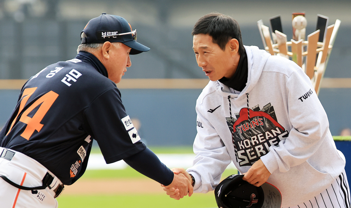 26일 서울 잠실야구장에서 열리는 프로야구 2025 신한 SOL뱅크 KBO 포스트시즌 한국시리즈 1차전 한화 이글스와 LG 트윈스의 경기를 앞두고 한화 김경문 감독과 LG 염경엽 감독이 식전 행사에서 인사를 나누고 있다. 뉴스1 세부적으로 뜯어보면 한국시리즈만 가면 힘을 쓰지 못했다. 네 번의 한국시리즈 패배가 모두 4연패로 점철됐다. 두산 감독을 맡은 지 2년차였던 2005년에 한국시리즈에서 올랐으나 삼성에게 4연패로 물러났고, 2007년과 2008년엔 각각 먼저 2승, 1승을 이기고 시작했음에도 내리 4연패를 하며 준우승에 머물렀다. NC를 이끌고 한국시리즈에 오른 2016년에도 ‘친정팀’인 두산을 만나 내리 4연패를 하며 무릎을 꿇고 말았다. 2018시즌 도중 NC 지휘봉을 내려놓은 뒤 오랜 기간 KBO리그 무대를 떠나있던 김경문 감독은 2024시즌 도중 한화 사령탑으로 복귀했다. 그리고 재임 2년차인 올해 한화를 33년 만에 전반기 1위로 이끄는 등 돌풍을 일으켰다. 8월에 다소 부진하면서 한국시리즈 직행 티켓은 놓쳤으나 삼성과의 플레이오프에서 5차전까지 가는 혈투 끝에 3승2패로 승리했다. 한화는 2006년 이후 19년 만에 한국시리즈 무대에 섰다.