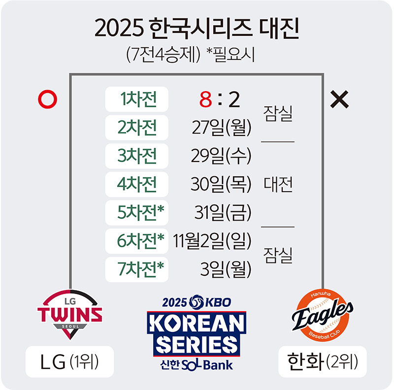 두 팀이 다시 만날 KS 2차전은 27일 잠실구장에서 열린다. 한화는 베테랑 류현진을 선발로 내세워 반격을 노린다. LG는 당초 2차전 선발이 예상됐던 요니 치리노스가 옆구리 담증세를 보여 임찬규를 선발로 예고했다.