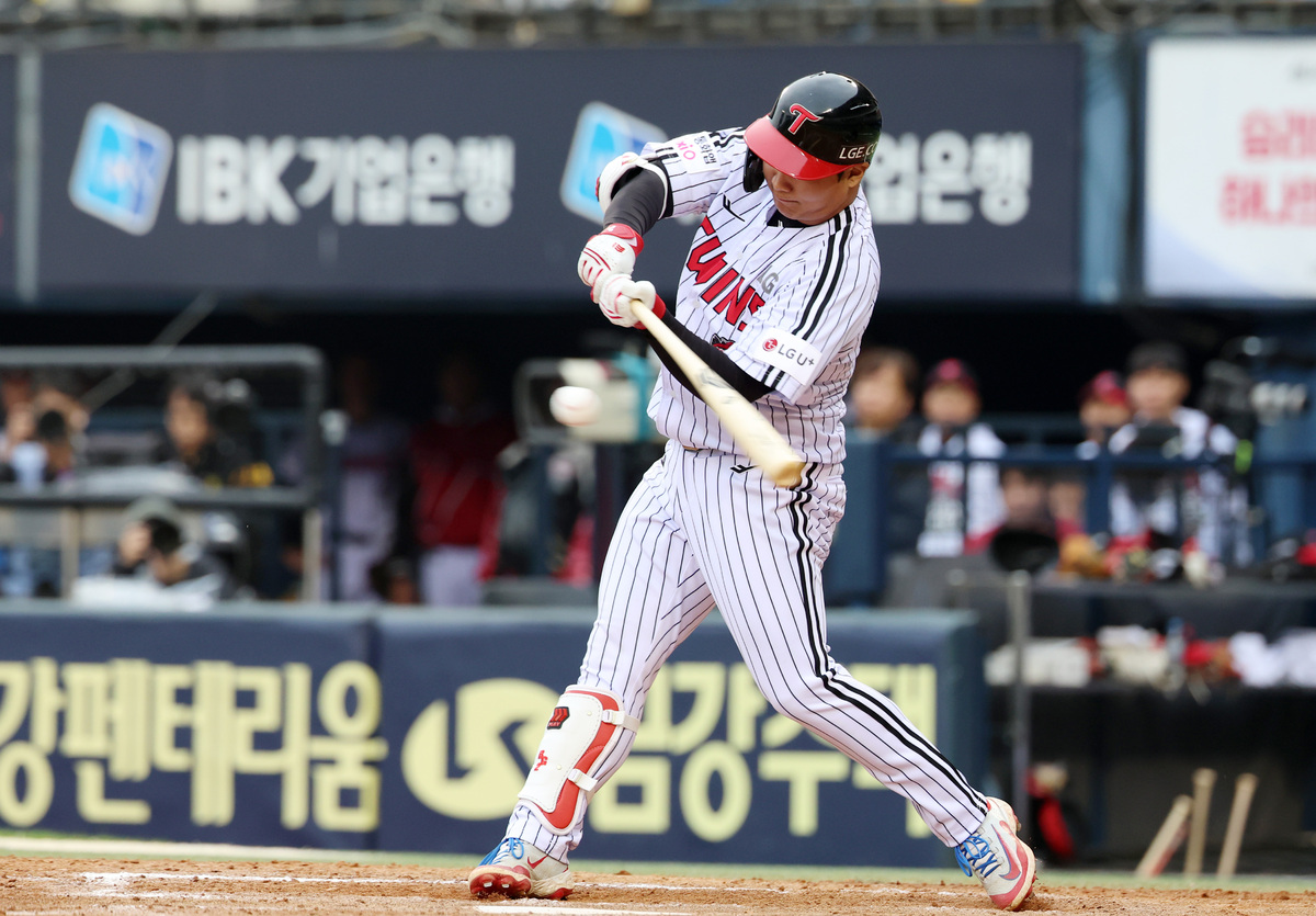 26일 오후 서울 송파구 잠실야구장에서 열린 2025 KBO 한국시리즈 1차전 한화 이글스와 LG 트윈스의 경기, 6회말 2사 1,2루에서 LG 문보경이 1타점 안타를 날리고 있다. 뉴시스 LG는 지난 1일 정규시즌 일정을 마무리했다. 게다가 마무리 모양새가 영 좋지 못했다. 시즌 막판을 3연패로 마무리했기 때문. 정규시즌 우승 확정도 자신들의 손으로 한 게 아니라 SSG가 지난 1일 한화 마무리 김서현을 상대로 2-5로 뒤지다 9회 2사 이후 투런포 두 방을 터뜨려 승리해준 덕에 가능했다. 모로 가도 서울만 가도 된다고 했던가. SSG 덕에 정규시즌 마지막 3경기를 패하고도 한국시리즈 직행 티켓을 거머쥔 LG는 3주 이상을 푹 쉬며 재충전의 시간을 얻었다.