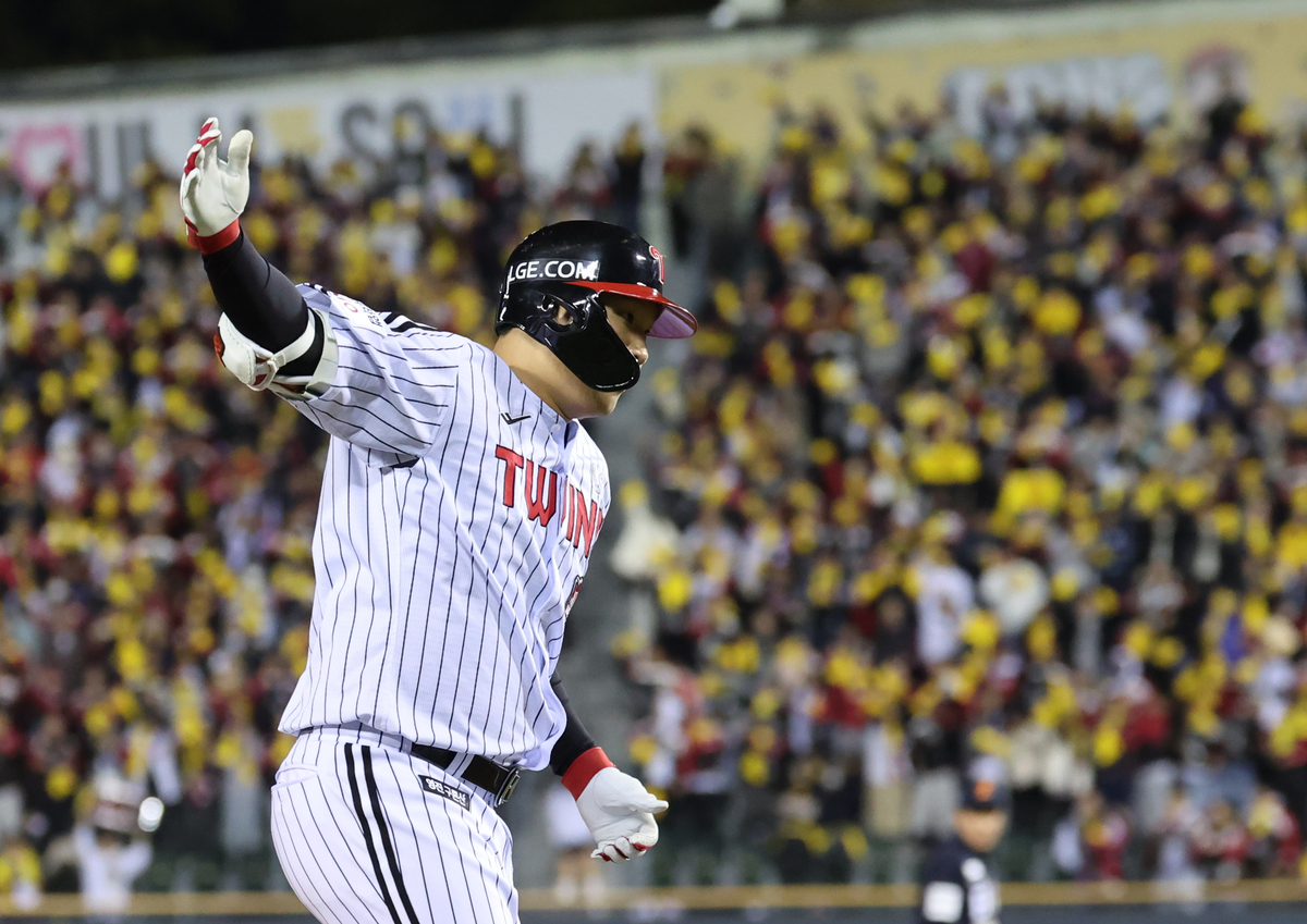 27일 서울 잠실야구장에서 열린 2025 프로야구 한국시리즈 한화 이글스 대 LG 트윈스 2차전. 8회말 2사 1루 LG 문보경이 2점 홈런을 친 뒤 기뻐하고 있다. 연합뉴스