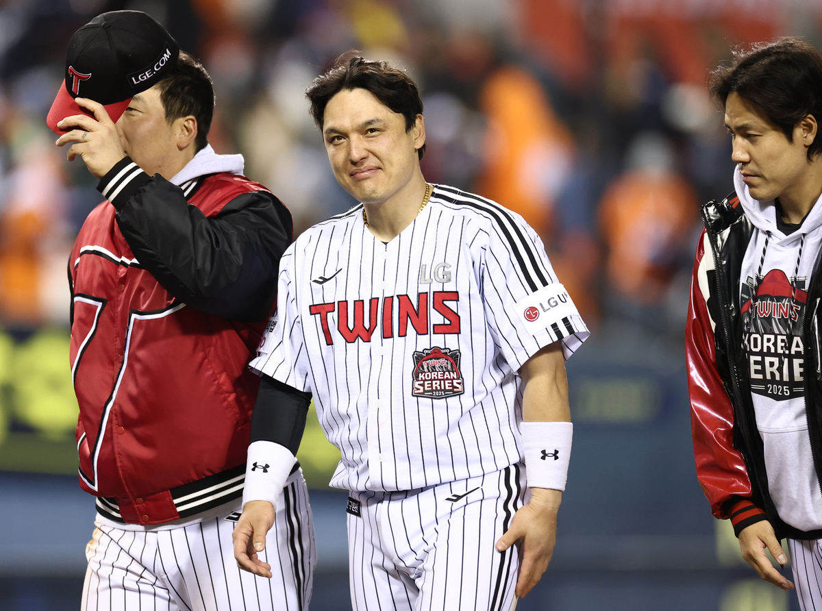 27일 서울 잠실야구장에서 열린 2025 프로야구 한국시리즈 한화 이글스 대 LG 트윈스 2차전. 13대 5 LG 승리로 경기가 끝난 후 박동원이 관중을 향해 인사를 하고 있다. 연합뉴스