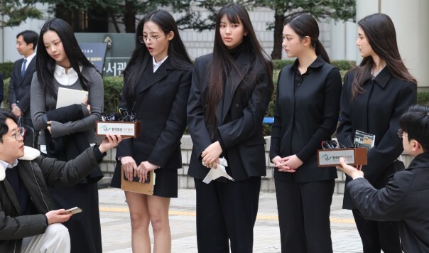 그룹 뉴진스 멤버들이 지난 6월 서울 서초구 서울중앙지방법원에서 활동 금지 가처분 심문 기일을 마친 뒤 취재진 질문에 답변하고 있다. 뉴시스 팀버니즈는 뉴진스를 지지하는 일부 팬들이 결성한 단체로, 하이브와 어도어의 갈등이 정점에 달하던 시기에 만들어진 팬 연합이다. 팀버니즈는 스스로를 ‘뉴진스를 지지하는 각계각층의 전문가 집단’이라고 소개하고 있으며, 뉴진스 멤버 하니의 국회 국정감사 출석을 지지하는 등 뉴진스의 활동 전반에서 활발한 활동을 펼쳤다.