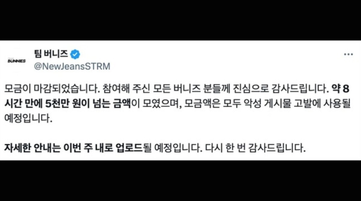 앞서, 팀버니즈는 지난해 10월 21일 “뉴진스 관련 악성 게시물에 대응하겠다”며 온라인에서 기부금 모금 활동을 벌였고, 약 8시간 만에 약 5000만원 이상의 기부금이 모였다.