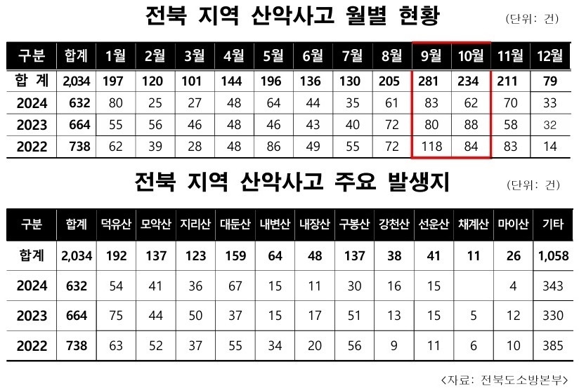 28일 전북도소방본부에 따르면 최근 3년간(2022~24년) 도내에서 발생한 산악사고는 총 2034건이며, 이 중 400여건이 9월과 10월에 집중됐다. 산악사고 5건 중 1건이 주로 가을철에 발생한 셈이다.