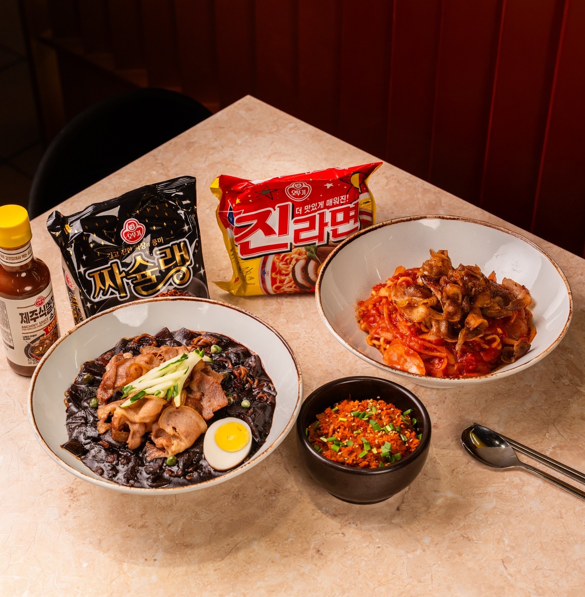 협업 메뉴는 ‘진라면 나폴리탄’, ‘제주 멜젓소스 덮밥’, ‘흑돼지 짜슐랭’ 3종이다. ‘진라면 나폴리탄’은 진라면의 깊은 감칠맛에 토마토의 산미와 풍미를 더해 남녀노소 즐기기 좋은 퓨전 스타일로 구현했으며, ‘제주 멜젓소스 덮밥’은 제주산 멜젓의 짭조름한 풍미를 살려 라면·밥 어디에나 조화롭게 어울린다. ‘흑돼지 짜슐랭’은 숙성 흑돼지의 육즙과 불맛을 살린 특제 소스로 든든한 한 끼는 물론 여행 중 간편 메뉴로도 즐길 수 있다.
