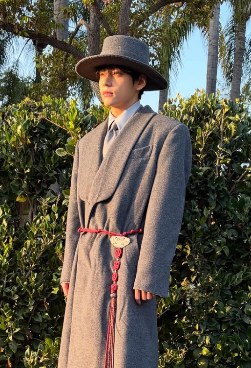 이날 뷔는 긴 회색 코트에 갓을 연상시키는 회색 모자를 착용하고 한국의 전통 장신구인 붉은색 매듭을 허리춤에 두르고 등장했다.